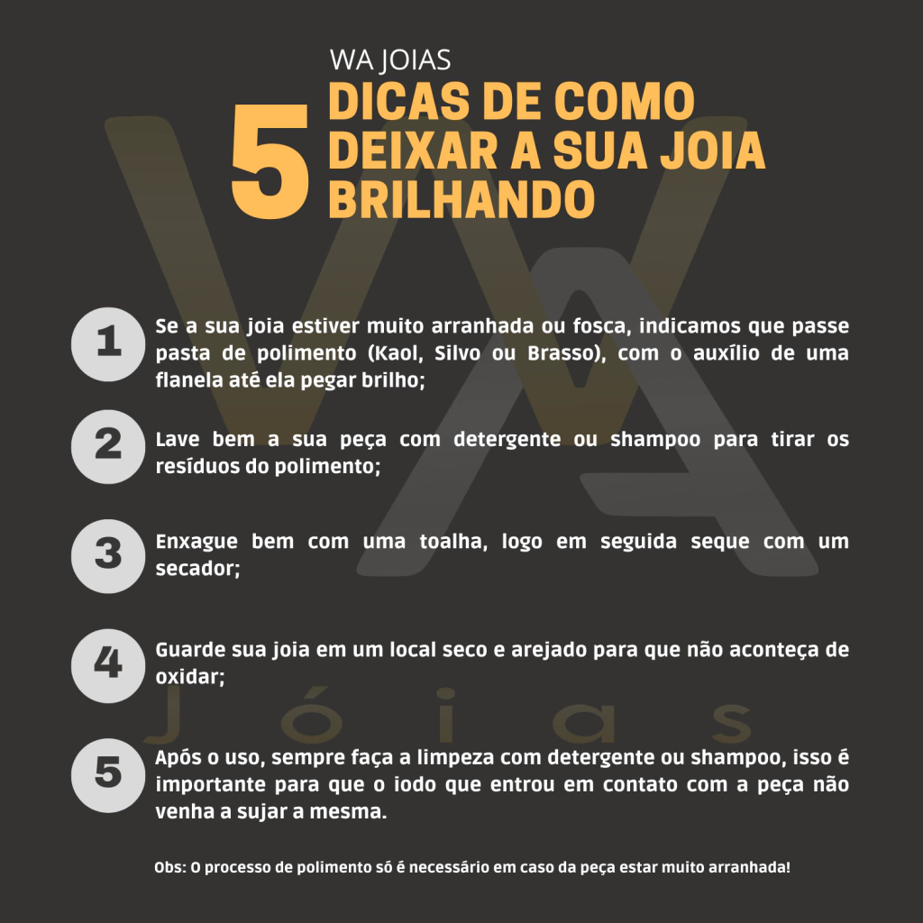 Jóias feitas de Moedas Antigas tem um dourado maciço. Por conta disso elas não descascam, não enferrujam e não perde a cor. A mesma necessita de uma limpeza frequente e, em alguns casos, o polimento que pode ser feito em casa mesmo. Tem 3 produtos que indicamos usar para o polimento (Kaol, Silvo ou Brasso). Esses produtos de polimento podem ser encontrados facilmente em mercados.
